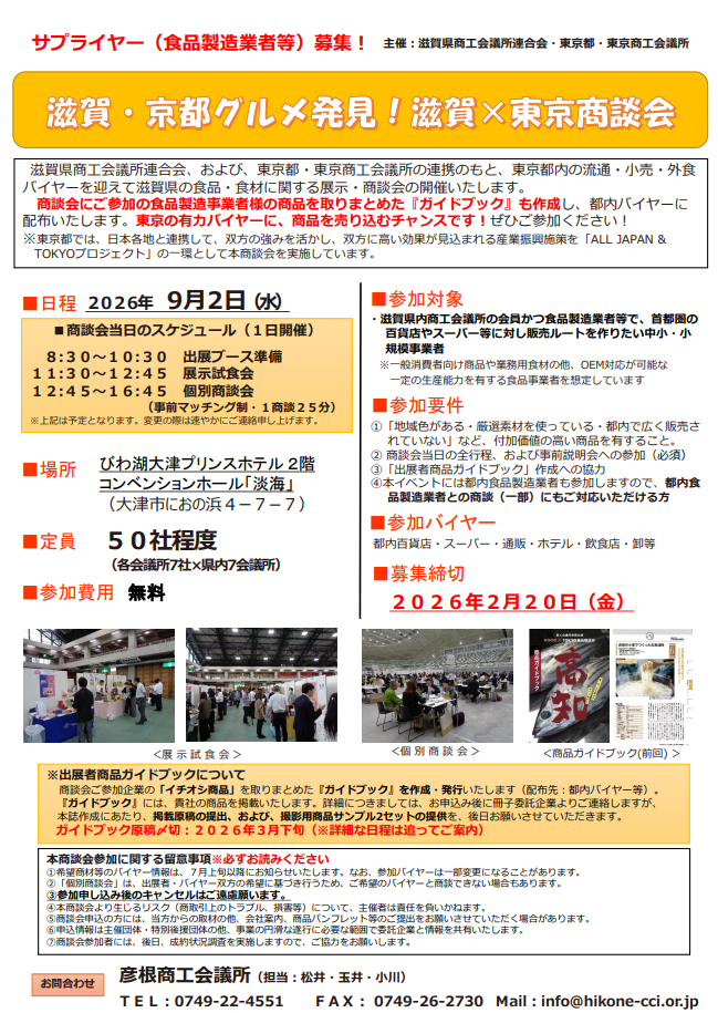 ・滋賀県内商工会議所の会員かつ食品製造業者等で、首都圏の百貨店やスーパー等に対し販売ルートを作りたい中小・小規模事業者