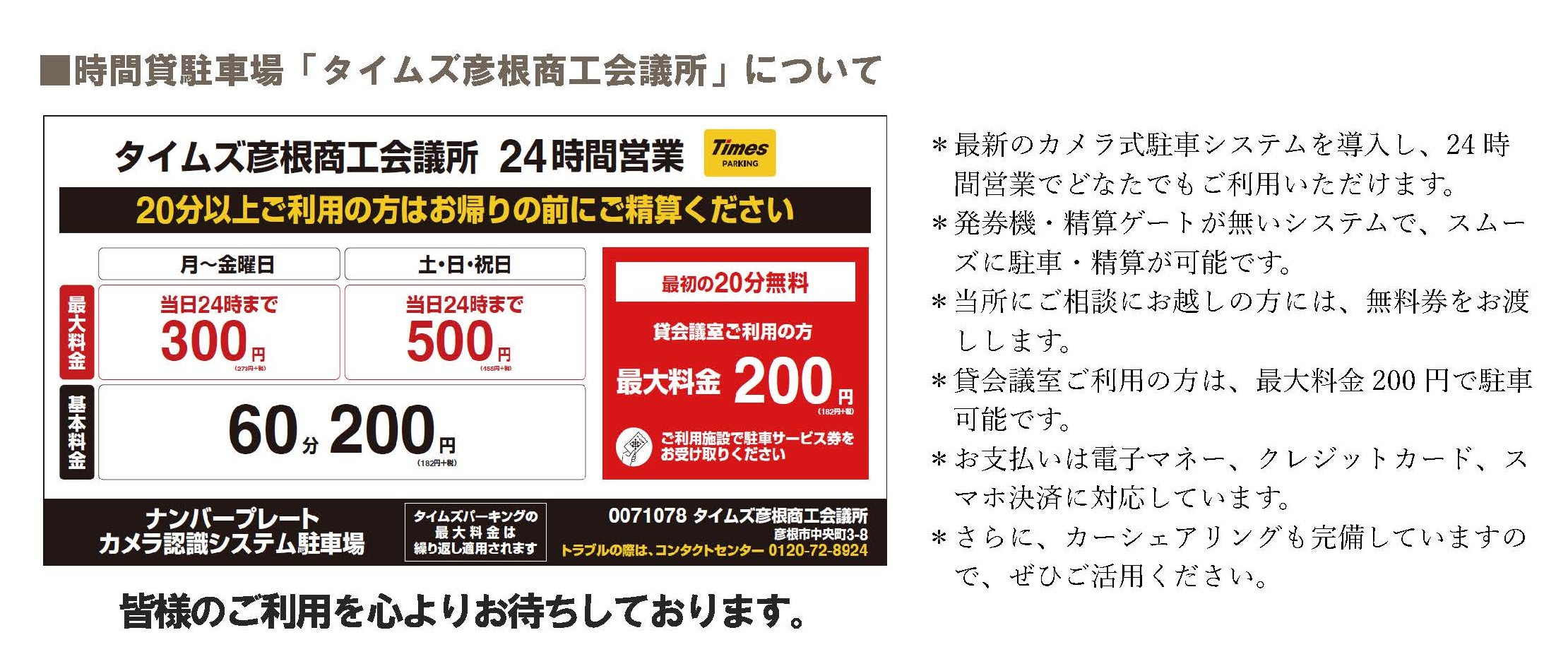 タイムズ彦根商工会議所 キャッシュレス化のご案内 最終更新:2026年04月16日 タイムズ彦根商工会議所は、4月23日(木)よりキャッシュレス専用駐車場となります。 当駐車場では、現金はご利用いただけなくなりますので、ご注意ください。 一覧へ戻る